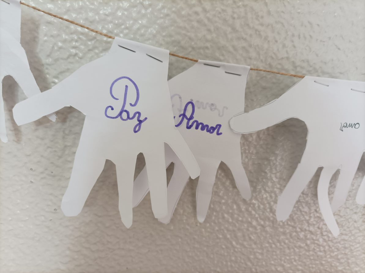 Durante a estadia em sala de aula, construíram um coração com cartão, lãs e amor.